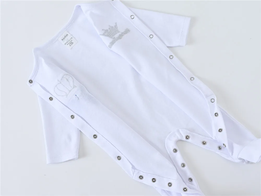 Composto por macacão com estampa de coroa, boné e luvas, este conjunto unissex é perfeito para todas as estações e ocasiões — desde passeios especiais até momentos de carinho em casa.